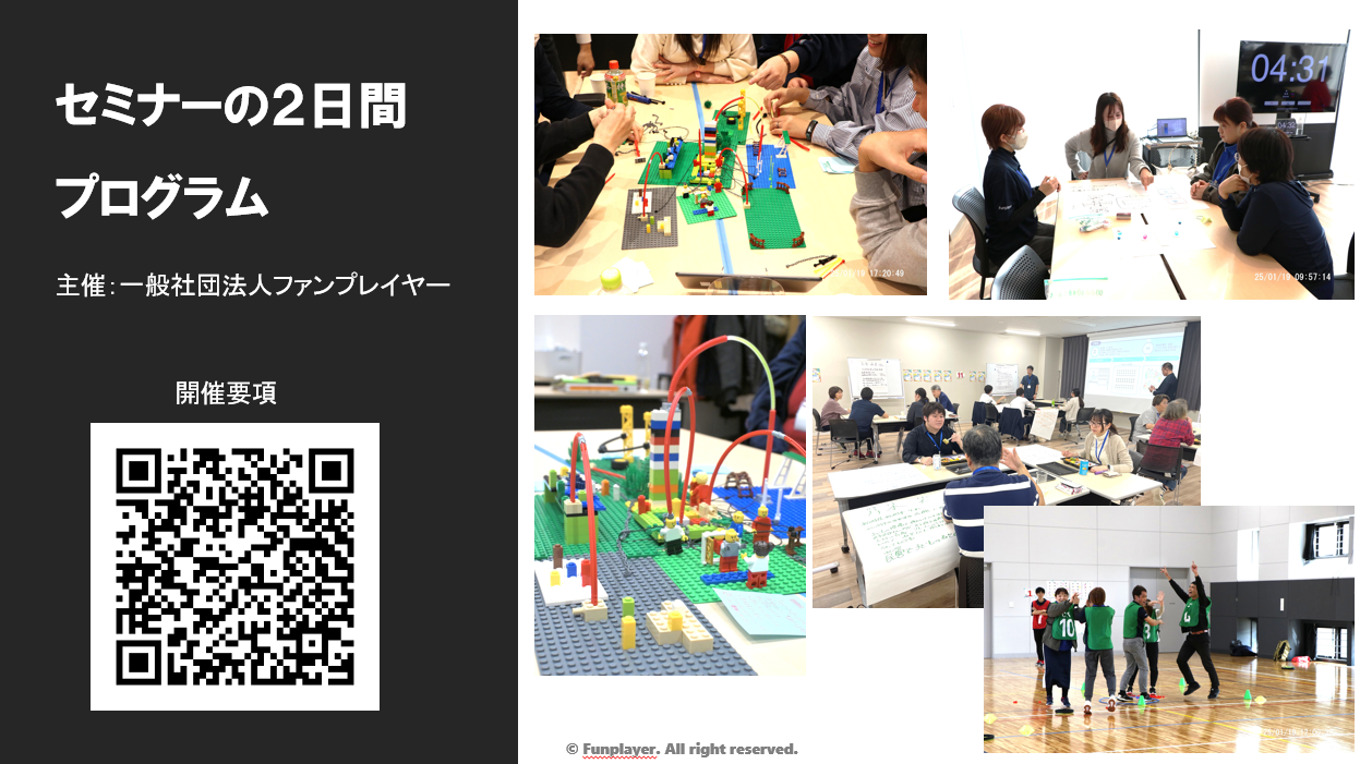 児童厚生員、放課後児童支援員、PTAスタッフを対象に、児童向けの「集団遊び」コンテンツの提供とその開発に向けたノウハウを提供。特に、子どもの社会スキル、ライフスキルのなどの非認知能力と遊びとの繋がりを可視化したプログラムや様々な場面に対応したファシリテーションスキルを提供。